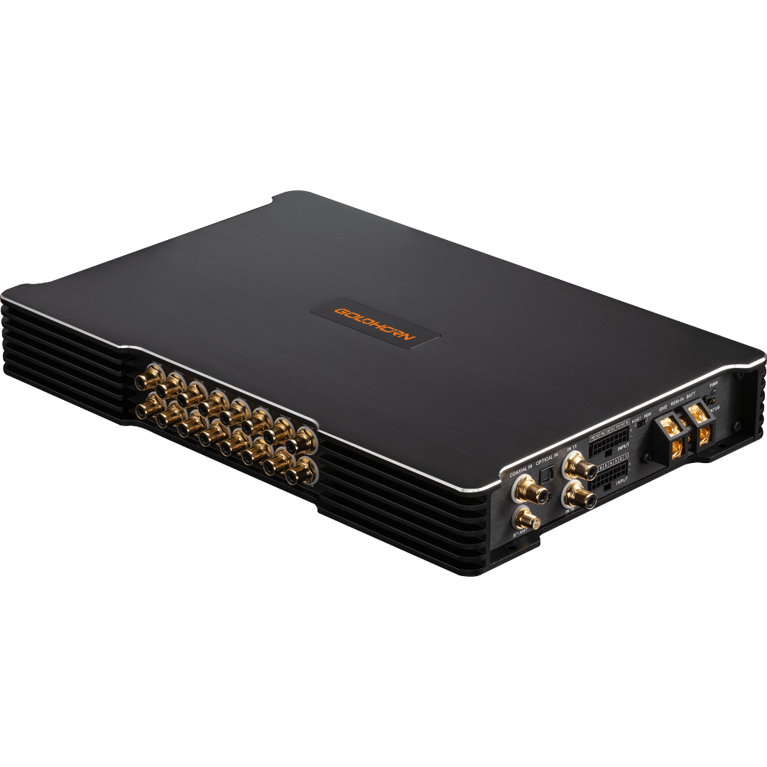 Le GOLDHORN DSPA 1216 Plus est l’Amplificateur DSP tout-en-un idéal pour les systèmes haut de gamme, avec 24 canaux DSP, 12 sorties amplifiées et 2 canaux BLT pontés de 200 W chacun. Il offre un contrôle, une puissance et une immersion surround incomparables.