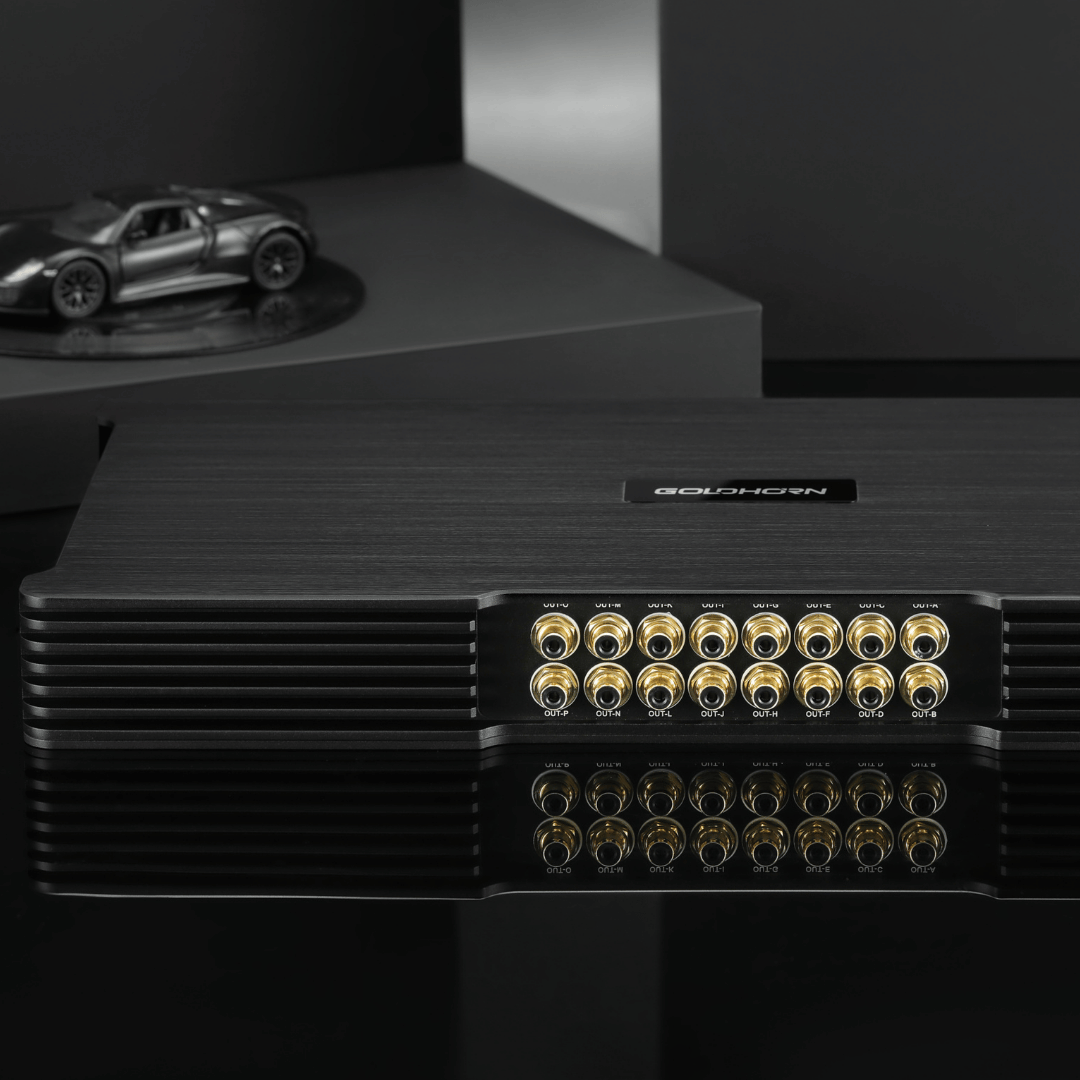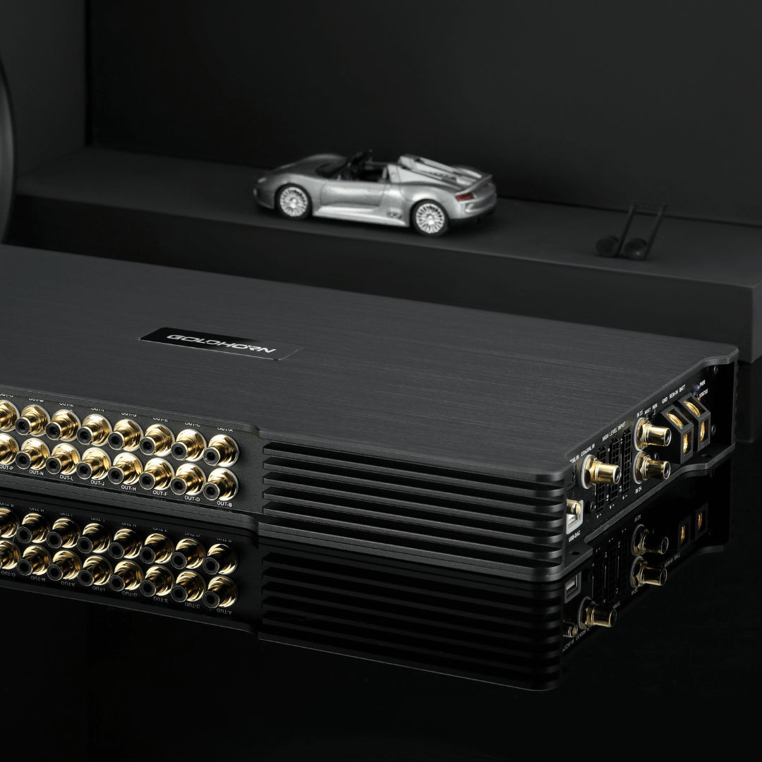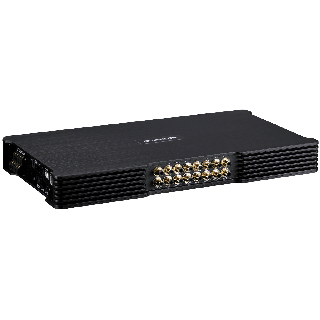 Le GOLDHORN DSPA 2416 Ultra est un Amplificateur DSP haut de gamme avec 36 sorties DSP, 24 canaux amplifiés jusqu’à 150 W, un mode ponté optionnel et une entrée OTG. Conçu pour les voitures de luxe et les véhicules électriques dotés de systèmes audio complexes.