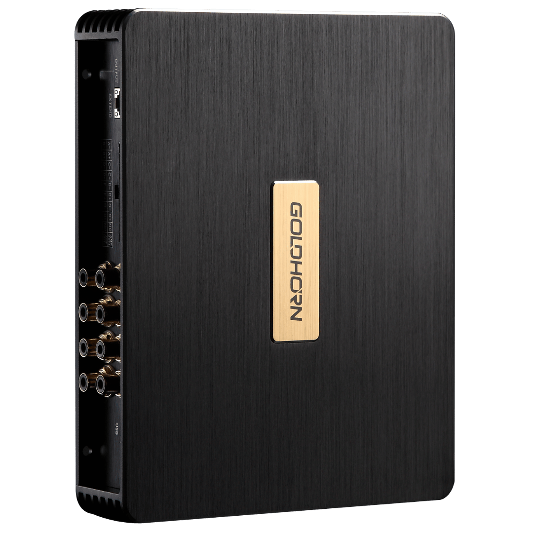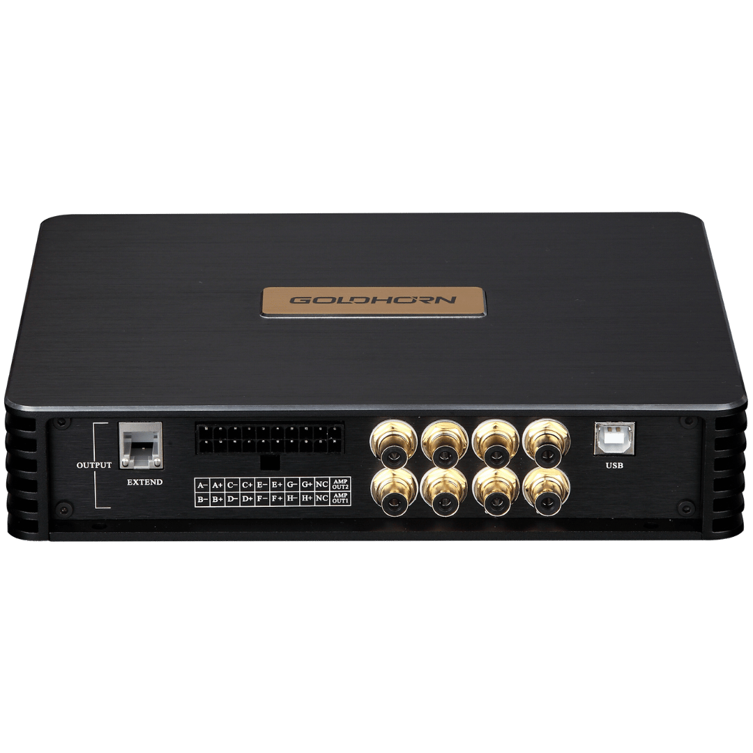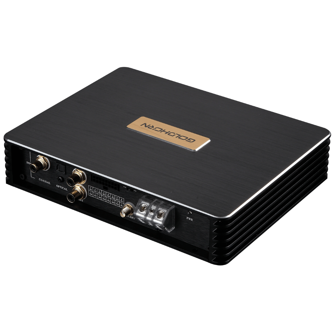 Le GOLDHORN DSPA 816 Pro est un amplificateur DSP haut de gamme doté de 8 canaux amplifiés et de 16 sorties DSP. Avec un puissant amplificateur Classe D délivrant jusqu’à 80W par canal, un égaliseur 31 bandes et des entrées numériques étendues (y compris optique et coaxiale), ce système est conçu pour les améliorations audio sérieuses dans les véhicules de luxe. Le DSPA 816 Pro intègre également la technologie SKYATOM Surround et le contrôle via volant via Bluetooth®, pour une expérience utilisateur incomparable.
