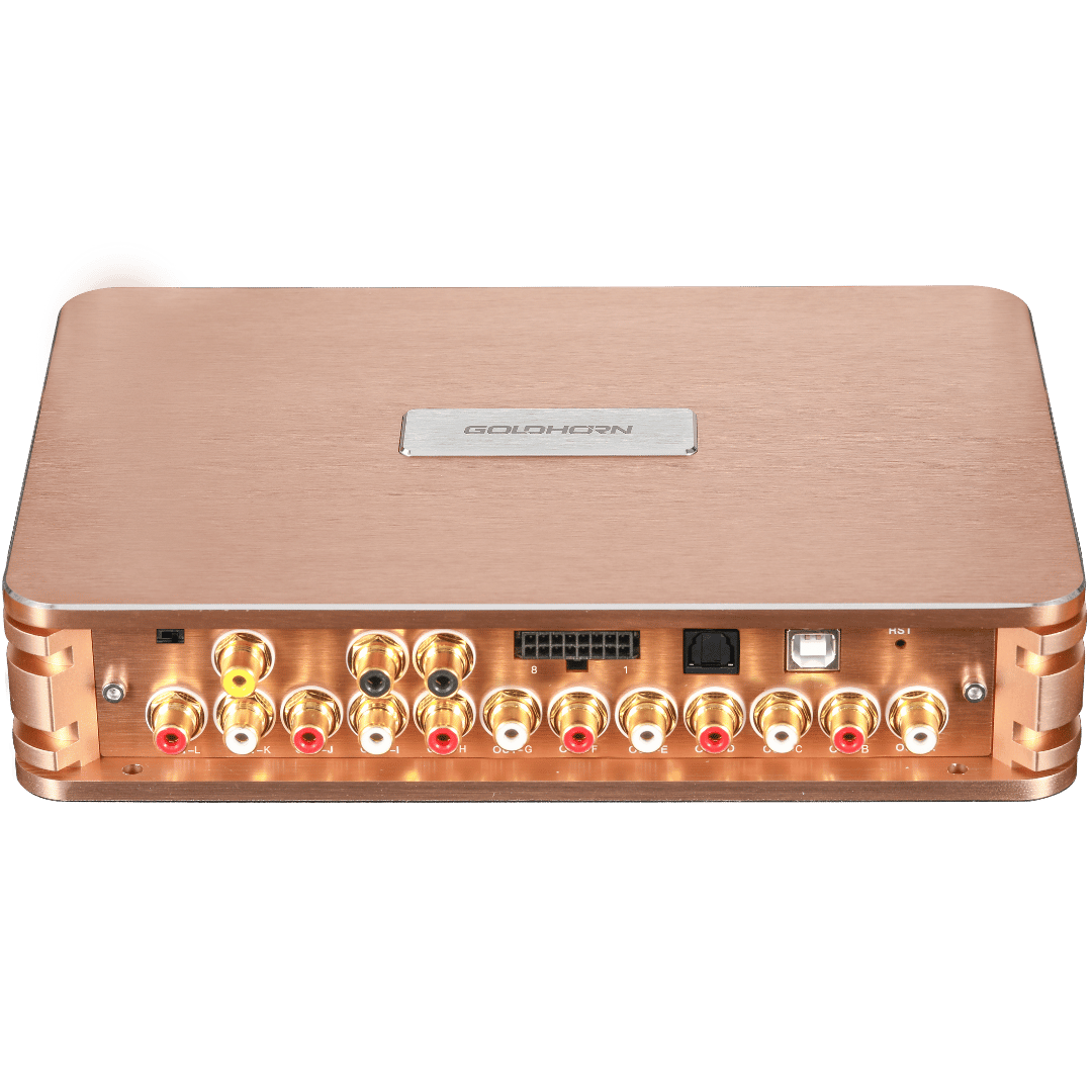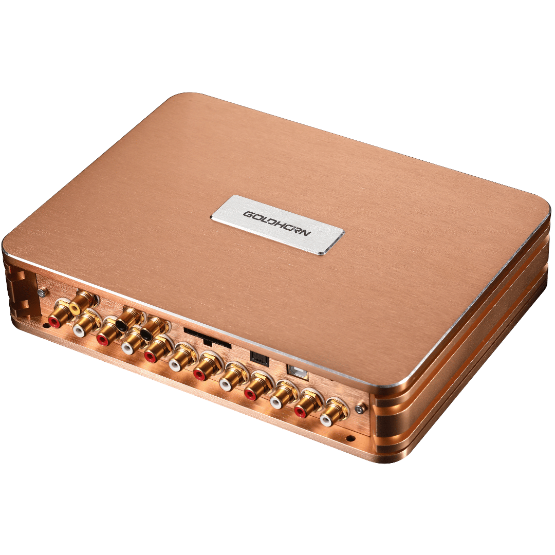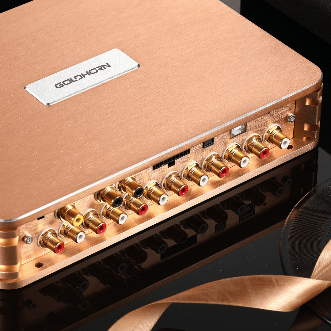 Le GOLDHORN P2 DSP Pro V2.0 est un lecteur multimédia numérique haut de gamme et un processeur DSP 12 canaux réunis dans un seul système. Équipé de six DAC ESS ES9038Q2M et du système audio propriétaire GHA1000, cet appareil délivre un son chaleureux, musical et d’une précision exceptionnelle. Les 12 sorties RCA permettent des configurations actives 3 voies à l’avant et à l’arrière, tandis que l’entrée optique assure la compatibilité avec les lecteurs CD haut de gamme. Grâce au lecteur multimédia intégré, vous pouvez écouter votre musique via Bluetooth®, Wi-Fi ou depuis un support SSD/HDD. Le tout est piloté par un DSP professionnel 31 bandes avec réglage de phase variable jusqu’à 360° par canal.